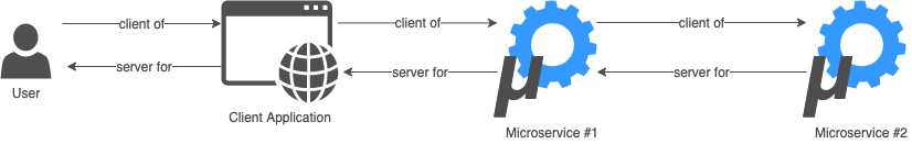 - The client application is a client of Microservice #1, and Microservice #1 is a server for the client application.